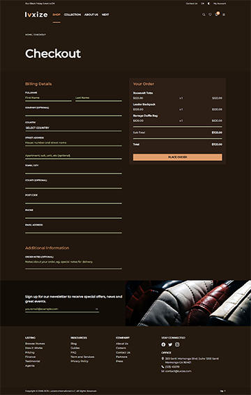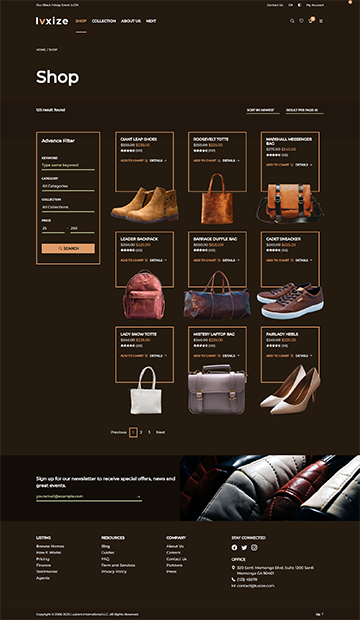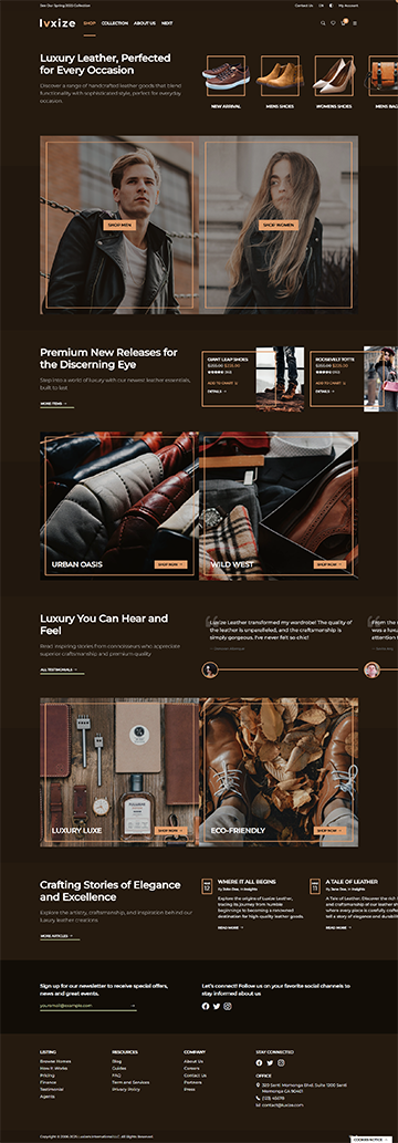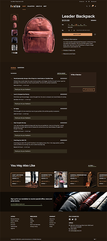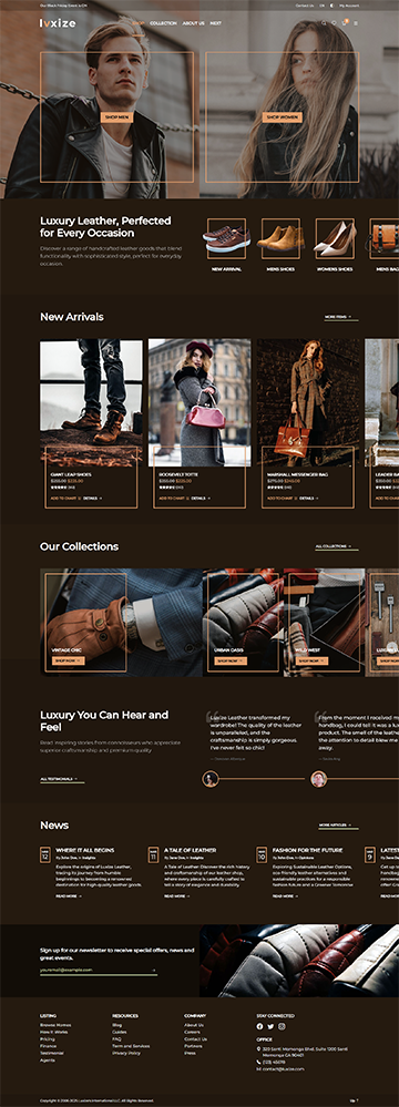 Luxize Leather Shop specially designed to showcase your luxurious leather shop with elegance and style. Built using Bootstrap, this minimal yet responsive and modern template offers a seamless user experience, making it easy for guests to explore products, collections, make order and purchase, and discover your shops's unique features. Perfect for leather shop, or all shop in general. This template combines sophistication with functionality to elevate your online presence and attract more visitors.